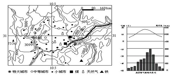 材料一?左下图四川盆地等高线略图,右图是重庆市气温降水柱状图。