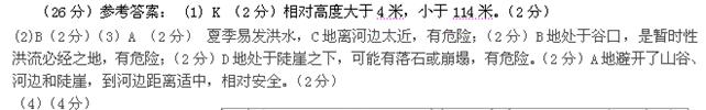 (3)暑假期间,某中学在该地组织地理夏令营活动。旅途中计划安排在山上宿营,现有A、B、C、D四个地点可供选择,试从四个地点的地貌特征反应出的安全性角度考虑,选择哪个地点宿营最合适?并说明理由。(10分)