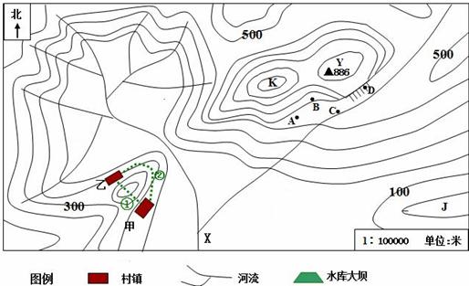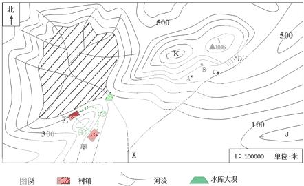 (4)政府准备在此区域修建修建水深为100米的水库,在图中作出水库大坝的最佳位置?并用斜线画出图中水库淹没的区域。(4分)