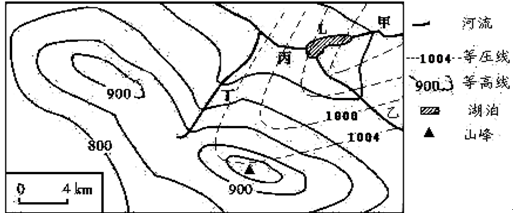 4、单选题 图为我国某地等高线图(单位:米)及某日某时海平面等压线分布图(单位:百帕)。
