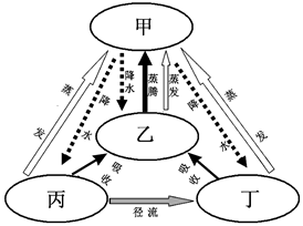 小题1:有蒸腾作用的是生物圈,符合的是乙;丙处有径流可以判断为岩石圈;丙处径流最终汇入河流或海洋,丁为水圈;乙、丙、丁都可以蒸发形成水汽到大气圈,甲为大气圈。符合的是A。