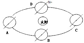 根据图中地轴倾斜方向以及北极所在可以判断此时A为夏至,C为冬至。地球自西向东公转,因此D为春分,B为秋分。