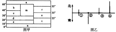 3、单选题 下图甲是“北半球气候类型分布模式图”,图乙表示在不同纬度的四地垂直竖立高度相同的旗杆,正午时旗杆顶点的影子周年变化范围示意图。完成以下问题。