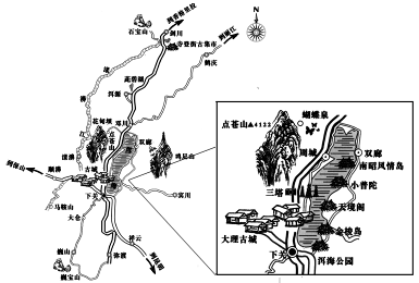 | 小题2:根据图中信息,该区域今后可持续发展的措施正确的有 A.修筑梯田,扩大粮食种植面积 B.扩大水域面积,发展水产养殖 C.提高植被覆盖率,保护生态环境 D.在山区退耕还林、退耕还湖