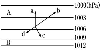 (3)图中a垂直于等压线由高压指向低压,为水平气压梯度力,是产生风的直接动力,b为风向与水平气压梯度力夹角小于90度,c应为地转偏向力,垂直于风向;d为摩擦力。