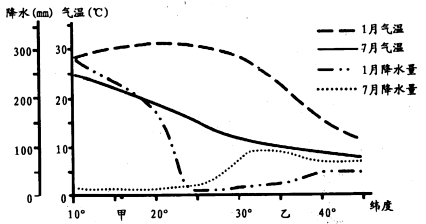 A.7月气温自北向南递减 B.甲地气温年较差比乙地大 C.l月降水量为南多北少 D.甲地降水季节变化小于乙地 |