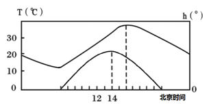 【小题1】我国没有极昼现象,可以判断上面的曲线是气温变化,下面的曲线是太阳高度。该地北京时间14时,地方时正午12点,根据经度每隔15°,时间差1小时,东边的比西边的早,可以计算出该地经度 是90°E,A对。