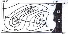 本题解析: 小题1:从等温线分析等高线可知,从甲开始,由于温度越来越低,海拔越来越高;然后温度越来越高,则海拔越来越低;28℃等温线之后,海拔又逐渐上升到乙。选择B项。 小题2:根据图中信息可知,该地处于我国东南沿海,c离海洋近,地形是处于山地的迎风坡,降水丰富。 小题3:该地气温最低的是21℃--22℃;气温最高的是28℃--29℃。二地温差6℃--8℃。所以相对高差是1000~1300米。
