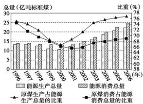 4、单选题 读“1996~2006年我国能源生产与消费总量及原煤在我国能源生产和消费结构中的比重变化图”,回答问题。