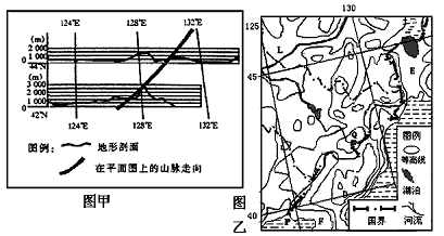 参考答案:(1)甲中山脉为长白山,乙中E—Q—F地势为低-高-低,结合图甲剖面图和图乙中的河流流向及等高