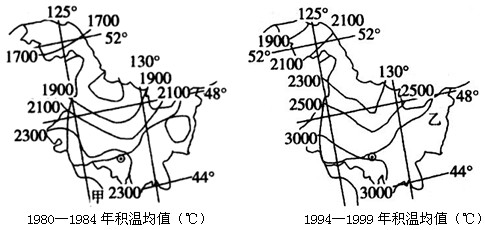 1、综合题 农业上一般认为,≥10℃积温(全年连续≥10℃日均温之和)2000℃等温线代表了种植水稻所需的最低积温线,积温达2300℃时,水稻可以稳定生长。读黑龙江省1980~1984年和1994~1999年积温均值示意图,回答下列问题。