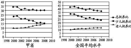 小题1:少儿和老人都是非劳动年龄人口,依据人口抚养比概念,总抚养比与少儿抚养比和老人抚养比都成正相关关系但不能说“完全”;图中信息表明甲省的少儿抚养比明显低于全国平均水平。