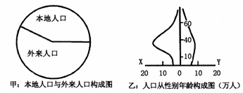 5、单选题  读“外来人口与本地人口构成图”和“人口性别与年龄构成图”,回答下列各题。