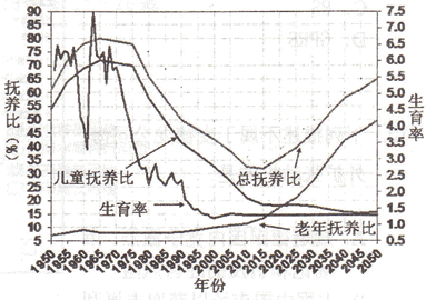 小题2:此题考查分析判断能力,解题的关键是不能误认为人口负债期就要鼓励生育,增加人口。由于人口红利期是总抚养比小于或等于50%的时间段,则人口负债期是总抚养比大于50%的情况,少儿人口(0~14岁)和老年人口(65岁及以上)比重增加,因此要优化教育结构,让少年儿童得到良好的教育,并强化就业培训,争取更多的就业机会;同时要优化产业结构,创造更多的就业机会,让部分身体健康、力所能及的老年人也可再就业,从而减轻劳动力短缺压力,同时因地制宜,完善养老保障制度,形成老有所养的社会福利体制。但由于我国人口基数大,人口增长较快,目前并不能鼓励生育,更不能恢复到60年代水平。