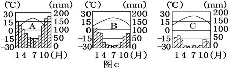 材料三 A、B、C三地区的气候要素图