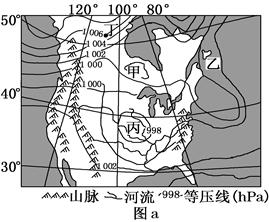 (1)材料一中甲等压线数值可能是________hPa,丁点此时的风向是。(2分)