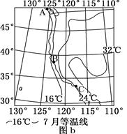 材料二 该区域西岸部分地区7月份的等温线(单位:℃)图