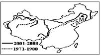 3、单选题 通常将下半年地面最低温度≤0℃的第一天定为初霜冻日期。图是“我国初霜冻日期为9月30日的多年等值线变化图”,读图完成问题。