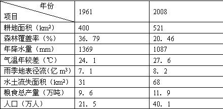 A.土壤肥力得以恢复 B.耕地面积增加 C.粮食产量增加 D.水土流失加剧 3、单选题 表是贵州省某山区县1961和2008年有关情况的统计资料,据此回答下列各小题。 |