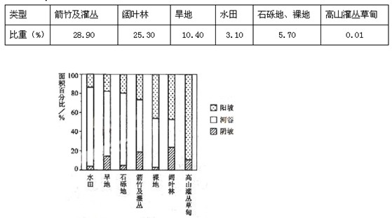 我国南水北调方案中涉及的某水源地总面积约94700km2,下表为该地区域部分土地覆盖类型面积构成,下图示意该区域部分土地覆被类型的地形构成 据此完成问题。