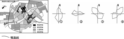 1.该城市的风频图应是2.最不宜在R 地布局的是3.影响该市商业区布局的主导因素是