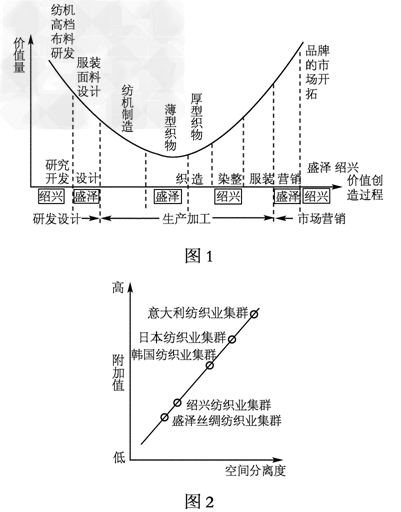 材料一 环太湖和环杭州湾地区丝绸纺织业具有悠久的历史,盛绸、苏缎、杭纺、湖绉享誉海内外。如今,这两大纺织业集聚区的核心分别是江苏盛泽、浙江绍兴纺织产业集群。图1为“盛泽与绍兴产业集群的价值链示意图”,图2则表示“全球价值链下纺织业集群的空间等级体系”。