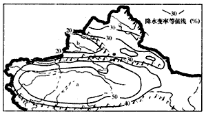 D.b地降水变率数值介于40~50