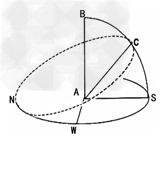 2、单选题 下图为A地地平面观察到的太阳视运动过程图”,其中虚线圈为太阳视运动轨迹,B为A地的天顶,C为太阳视运动某一位置。读图完成1-2题。