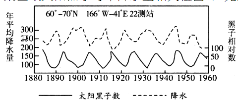 本题解析:本题考查太阳活动对地球的影响和读图综合分析能力。图示反映太阳黑子数较多时,则降水量较少,而太阳黑子数较少时,降水量较多,即两者呈负相关。
