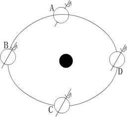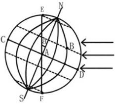 小题2:右图所表示的是甲图中A、B、C、D的________位置,此时是一年中的________节气,日期为________,太阳直射________纬线;