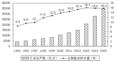 4、综合题 材料我国高技术产业工业总产值及其占制造业的比重(1995~2005年)