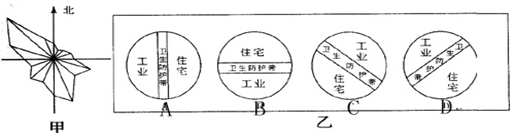 3、单选题 根据甲图风向玫瑰图,判断乙图中工业区和居民区的布局合理的是?