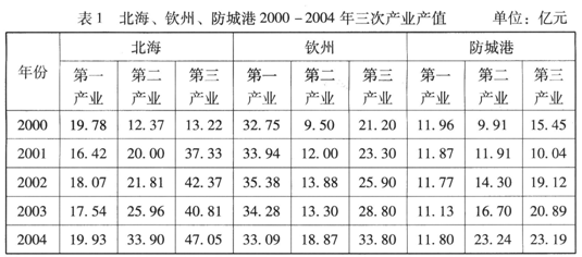 (2)据表1可知北海市的第一产业产值呈现波动变化特征。