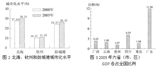 (3)据图3,2005年2005年广西GDP大于重庆。据图2城市化水平最高的是北海。