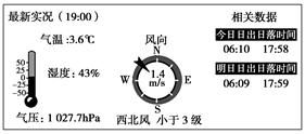 本题解析:读图可知今日日出时间为06:10,日落时间为17:58,明日日出时间为06:09,日落时间为17:59根据公式:昼长=日落时间-日出时间,可分别计算出今日昼长为11小时48分,明日昼长为11小时50分,由此可知上海此时的昼短夜长且昼渐长夜渐短,接近昼夜等长,此时太阳直射点由位于南半球由南向北运动接近赤道,此时节气接近春分,故A正确。