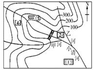 【小题1】在等高线地形图中,等高线分布密集则坡度陡,等高线稀疏则坡度缓和。从图中信息分析,①线上的等高线分布最稀疏,坡度最和缓。故选A。