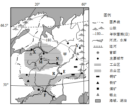 材料二:图中R河是内流河,以积雪融水补给为主。R河流经的甲平原是所在国政治、经济的核心区域,人口约1亿。 (1)比较X、Y两地年积雪期的长短,并说明原因。(3分) (2)比较分析R河MN段和EF段水文特征的差异。(5分) (3)分析该国在甲平原大力发展内河航运的主要原因。(4分) (4)简述甲平原南部种植冬小麦有利的自然条件。(4分)