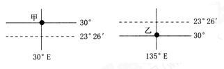 小题1:该题考查的是经纬网定位,根据图中的经纬度判断,甲位于北半球的埃及,乙位于南半球的澳大利亚,所以D对。A、B、C错。