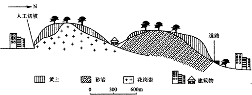 3、综合题 长江下游某城市边缘分布着丘陵,丘陵的基岩上有黄土覆盖(如图所示)。近年来,由于地域扩展,大量开挖山坡,该地在夏季暴雨后蹭发生多起黄土崩塌、滑坡灾害。