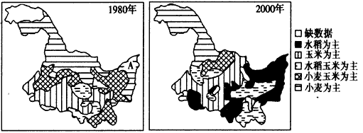 材料一:下图是1980年和2000年黑龙江省三大粮食作物分布示意图。