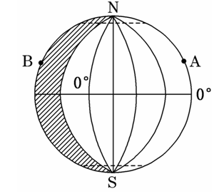 5、综合题 图中阴影部分表示夜半球,A、B两地均处在30°N。读图,回答下列问题。(14分)