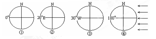4、单选题 下面四幅地球自转位置示意图中,表示北京时间为上午10点整的是: ( )