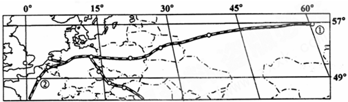 4、单选题 有人在某日12时(当地区时)从下图中的城市①乘火车前往城市②,于四天后的12时(当地区时)到达,据此判断下列各题。