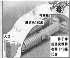 ? 挪威政府宣布在北极地区建造“末日粮仓”,又称为斯瓦尔巴全球种子库。位置见下左图。它将保存全球已知的所有农作物种子,目的是为了在地球遭遇了核子战争、自然灾害或气候变化等灾难时,劫后余生的人类还能重新播种,保证世界农作物的多样性,被喻为“诺亚方舟”。种子库于2008年2月26日正式竣工并启用。其简图见下右图。
