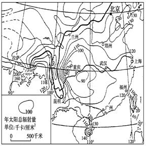 3、综合题 读“我国部分地区年太阳总辐射量图”,回答下列问题。(9分)