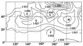 【小题1】读图可知,图中各字母均处于气压中心,但处于低压中心的为Z、X、P,而Q、M均处于高压中心,图中各字母所处位置只有位于低压中心。盛行上升气流,才有可能是阴雨天气。