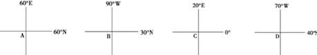 A.丙、丁 B.乙、丙 C.甲、乙 D.乙、丁 3、单选题  该图为世界四个地点的坐标,据此分析并回答1~2题。, |