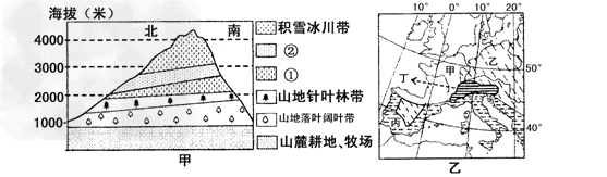 3、单选题 图为某山地植被垂直变化示意图(甲图)和该山地所在地区的气候类型图(乙图),乙图中甲乙丙丁表示不同类型的气候区,丁是该山地所属的气候区的范围,回答1-3题。