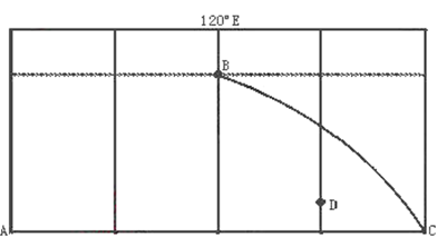 1、综合题 (12分)图中AC为赤道,BC为晨昏线的一部分,B点的地方时比A点早,此时D点地方时为15点,读后回答:(1)图中A点的经度为________,B点的纬度为_____________。(2)这一天太阳直射点的纬度位置在_____________,北半球的节气是_____________。(3)这一天北京(39°54′N)的正午太阳高度为_____________,与北京正午太阳高度相同的纬度是_____________。