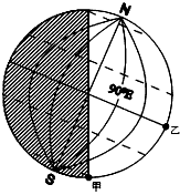 (3)此时南半球昼夜长短情况是___________,甲点的昼长为_______时,极夜的范围是___________。
